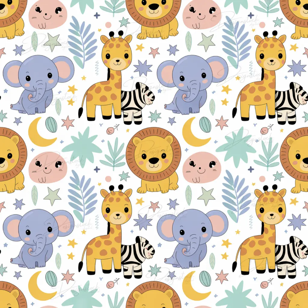 Adorable safari animal seamless patterns featuring cute lions, elephants, giraffes, and zebras. Perfect for baby shower decor, nursery prints, fabrics, scrapbooking, and more. Includes 4 high-quality PNG files (12×12″, 300 DPI) and 2 printable PDFs (CMYK & RGB).