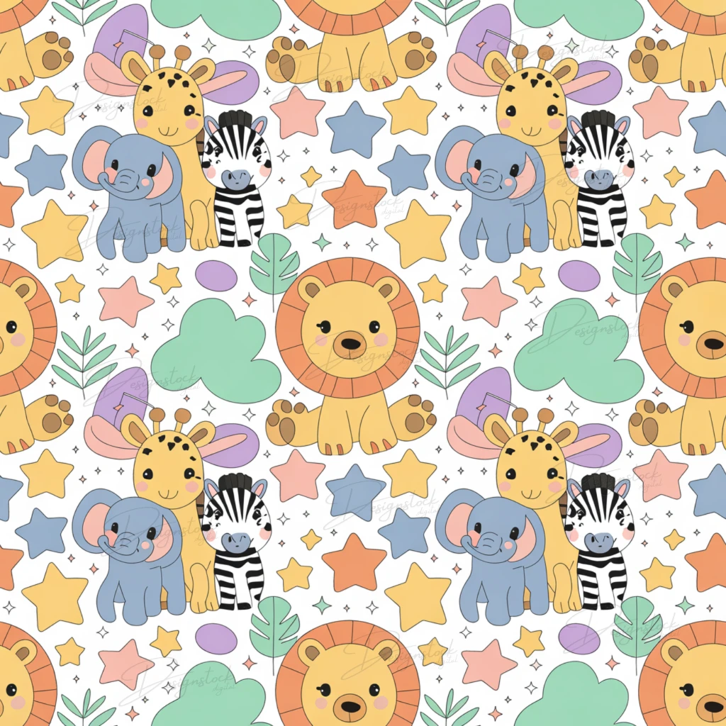 Each design features adorable lions, elephants, giraffes, and zebras surrounded by stars, moons, and leaves in soft pastel tones: ideal for baby products, nursery decor, kids’ stationery, scrapbooking, fabrics, and wall art.